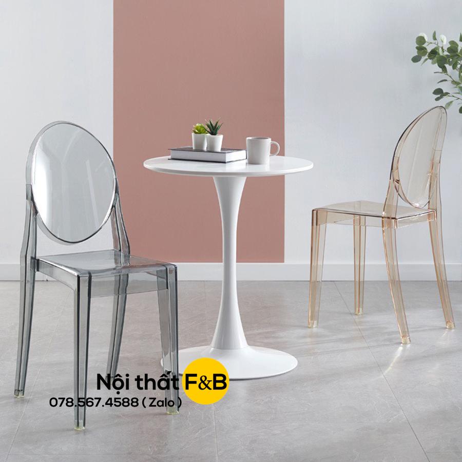 Một bộ bàn ghế cafe 2 người ngồi ấn tượng, xinh xắn mà bạn không thể bỏ qua với sự kết hợp của mẫu ghế nhựa trong Ghost và bàn tròn tulip hiện đại.