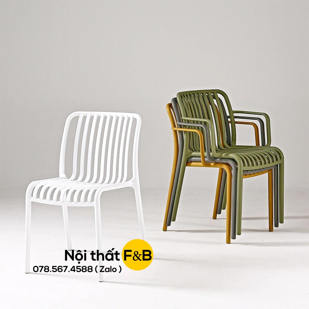 Mẫu ghế có khả năng chống chịu nắng mưa tốt, dễ dàng vệ sinh, với nhiều màu sắc ấn tượng cho không gian. Bạn có thể kết hợp chúng với các mẫu bàn tròn, bàn vuông hay bàn dài tùy ý.
